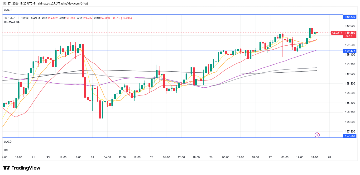 ドル円の1時間足チャート。3/27 19:00のレートは159.86。ちょうど意識されるライン上、上にブレイクすればドル円上昇期待できるが、介入警戒は必要になります。
