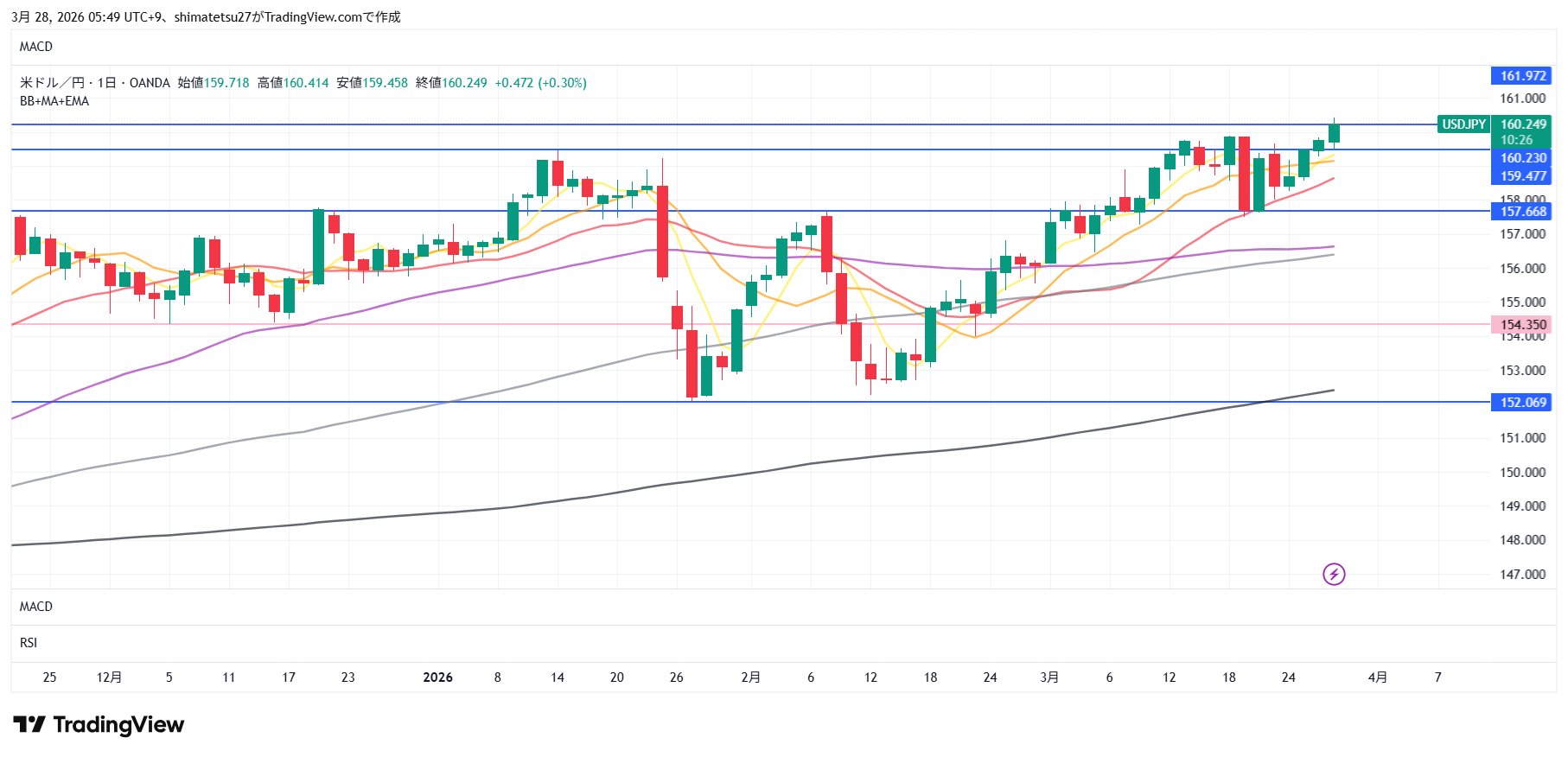 ドル円の日足チャート。3/26 6:00のレートは160.25。注目ラインは上は161.92で以前の為替介入のレベル。下は157.67となります。159.5以上は介入警戒のレベル。