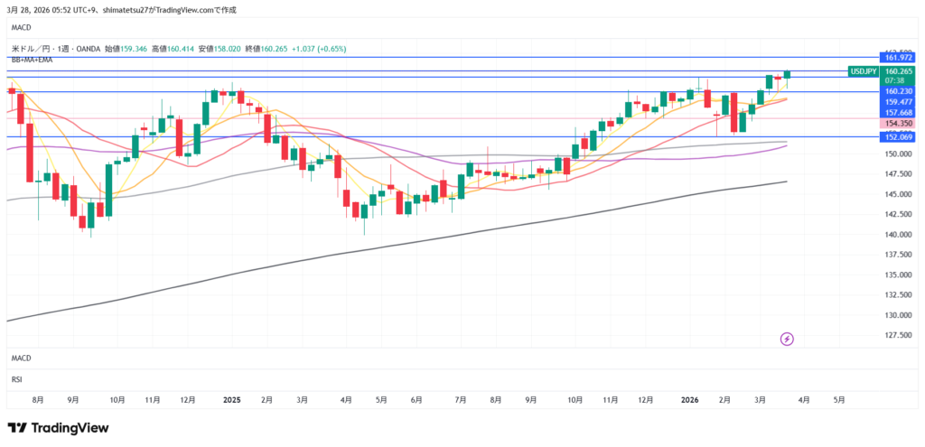 ドル円の週足。3月23日の週は下ヒゲが長い陰線。先週は4週連続の上昇が止まりましたがまた上昇。2025年1月から4月後半まで下落、その後上昇、2026年1月より下落傾向でしたが2月中旬から上昇。2月下旬に米・イラン戦争が勃発しました。