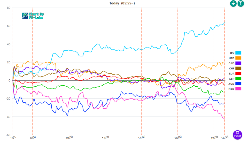 上は、26日の東京時間の通貨強弱。ロンドン時間から円買いとなっています。