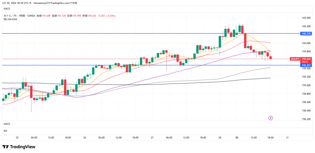 ドル円の1時間足チャート。3/27 18:30のレートは159.62。先週末の160円台から下落しました。