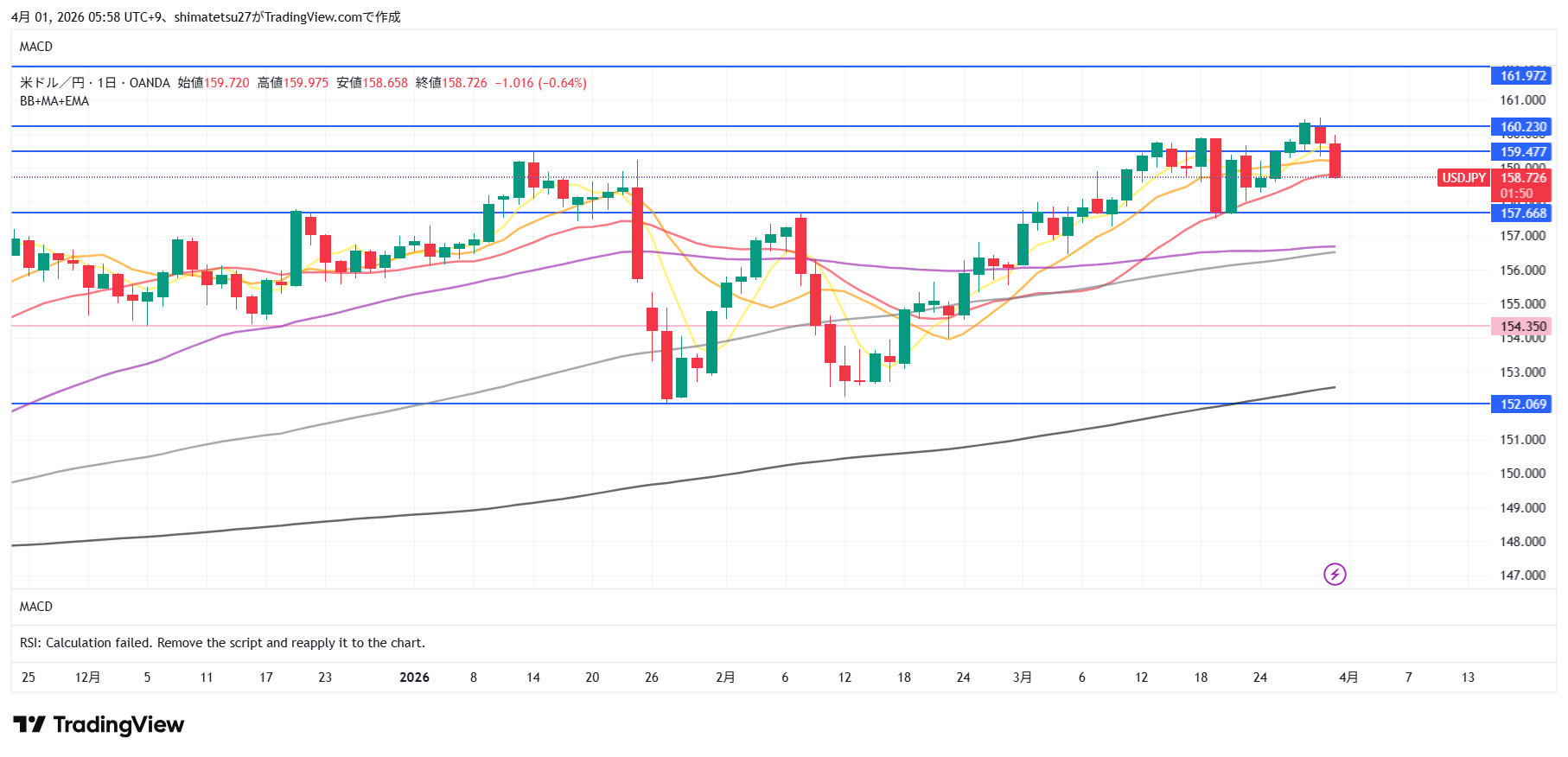 ドル円の日足チャート。4/1 6:00のレートは158.72。注目ラインは上は161.92で以前の為替介入のレベル。下は157.67となります。159.5以上は介入警戒のレベル。