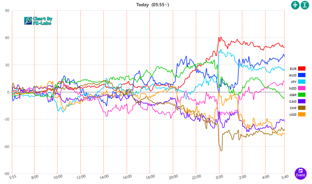 上は、31日の通貨強弱。ロンドン時間終了付近の0時頃、調整がおきています。ニューヨーク時間後半は、ユーロ・豪ドル・円が買い、ドル・スイスフラン・カナダドルが売りとなりました
