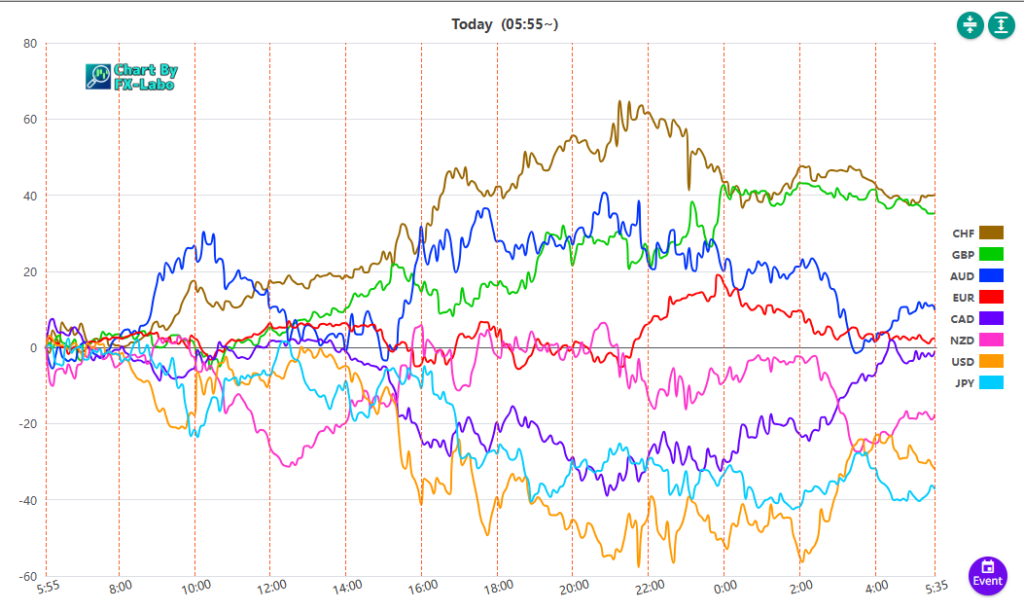 上は、1日の通貨強弱。スイスフラン・ポンドが買い、ドル・円が売りとなりました