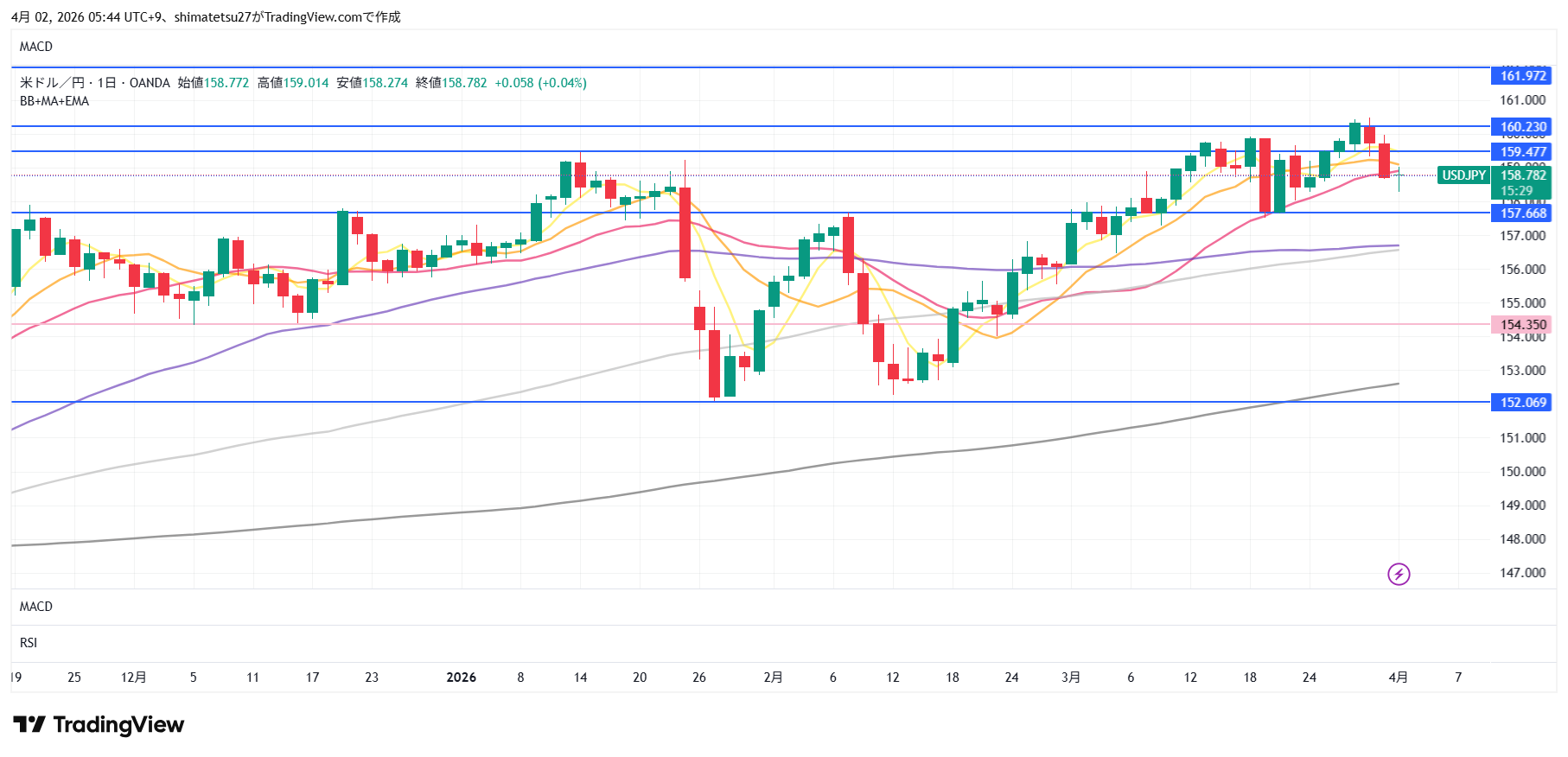 ドル円の日足チャート。4/1 6:00のレートは158.78。注目ラインは上は160.23。下は157.67となります。160以上は介入警戒のレベル。