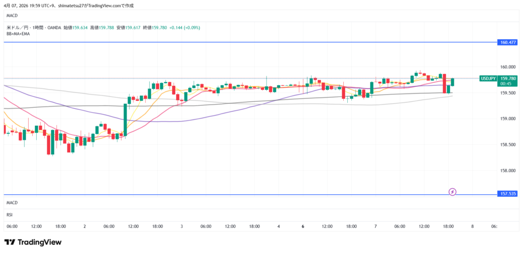 ドル円の1時間足チャート。4/7 17:30のレートは159.78。水平線とピボットを意識してスキャルやデイトレにのぞみたい。本日はボラティリティがでてからが勝負。