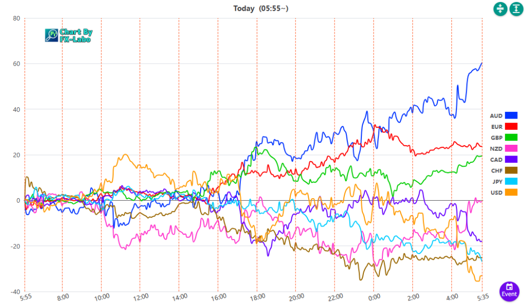 上は、7日の通貨強弱。ロンドン時間以降、豪ドルが買い、スイスフラン、ドルがやや売りとなっています。