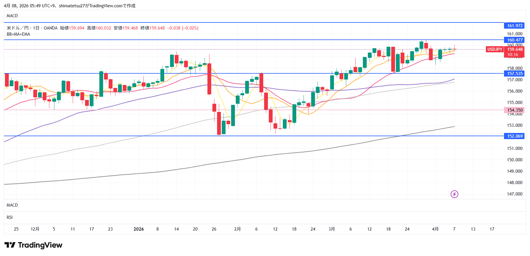 ドル円の日足チャート。4/7 6:00のレートは159.65。注目ラインは上は160.23。下は157.67となります。160以上は介入警戒のレベル。