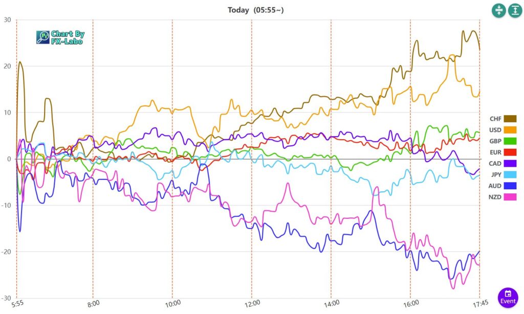 上は、10日の東京時間の通貨強弱。ドル、スイスフランが買い、豪ドル・ニュージードルが売りとなっています。。