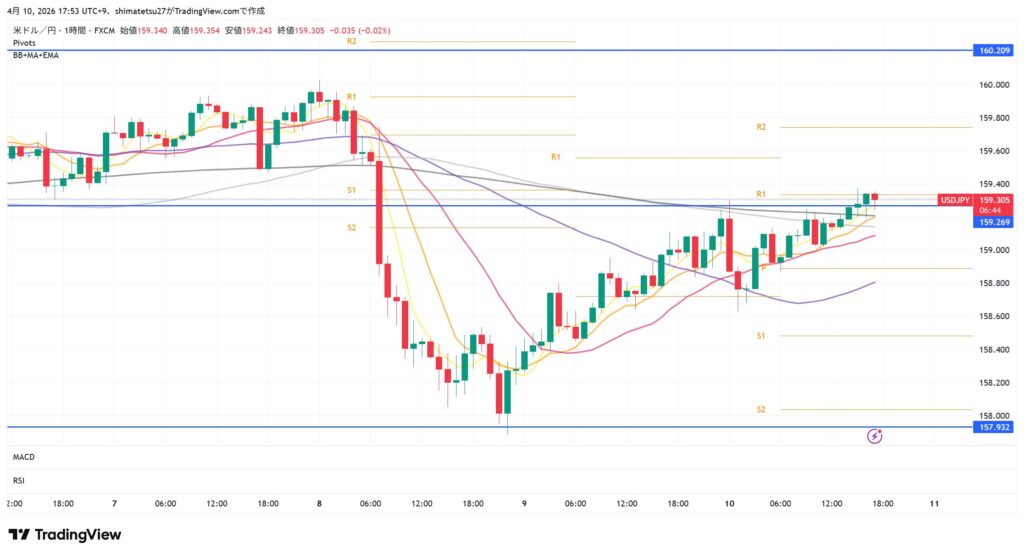 ドル円の1時間足チャート。4/10 18:00のレートは159.26。デイリーピボットR1が159.33付近でここはひとつの目安。ニュースのヘッドラインで動く可能性がありそう。エントリーは慎重に!