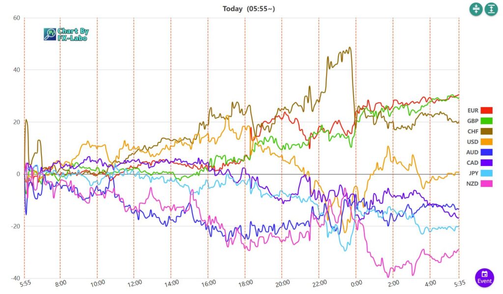 上は、10日の通貨強弱。スイスフランが買い、ニュージードルが売りとなっています。ドルと円は近いところにいて、ドル円は小動きになります