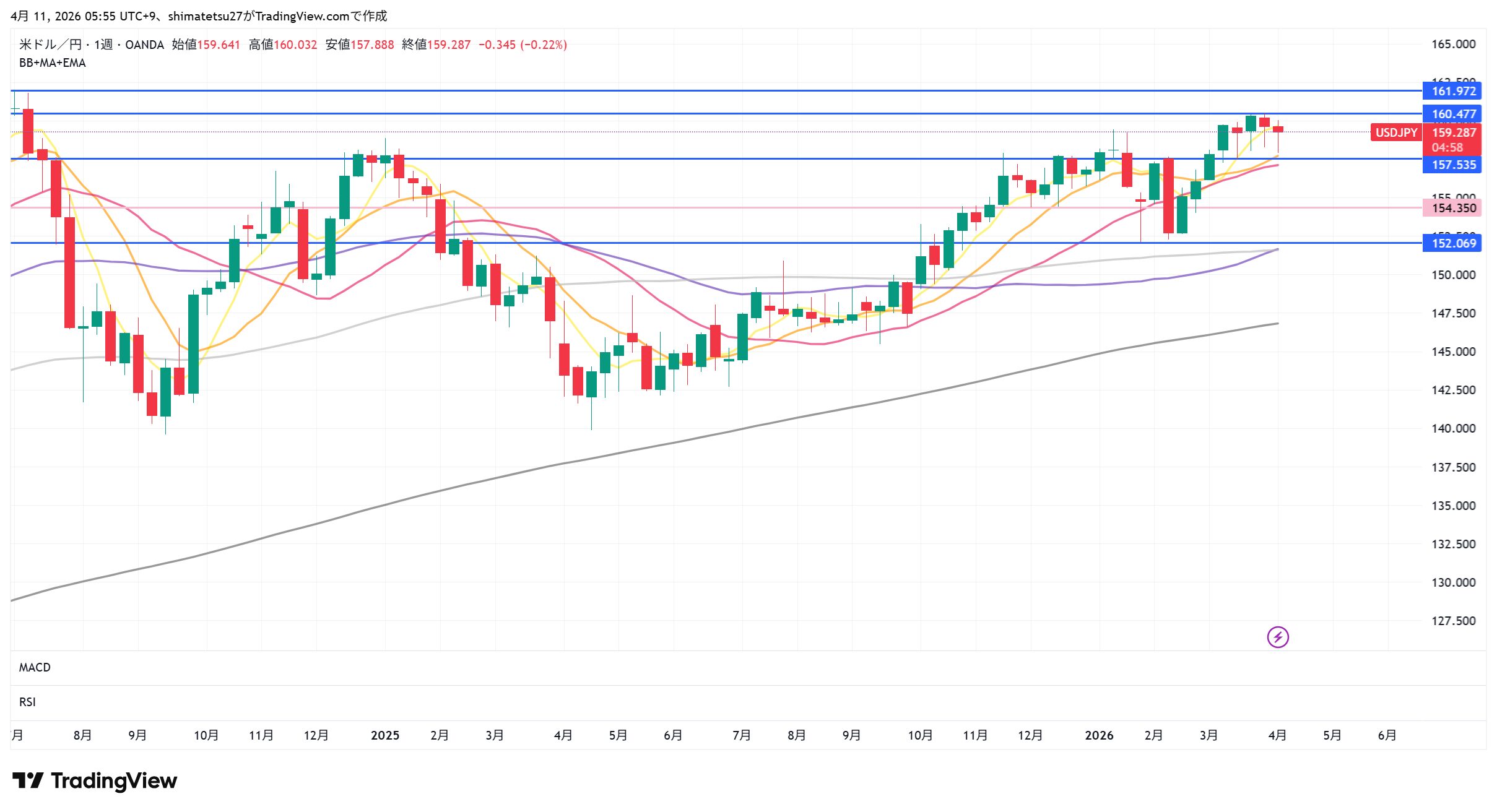 ドル円の週足。4月6日の週は下ヒゲ陰線。2025年1月から4月後半まで下落、その後上昇、2026年1月より下落傾向でしたが2月中旬から上昇。2月下旬に米・イラン戦争が勃発しました。ドル円は上昇し高止まりの状況で為替介入が警戒される