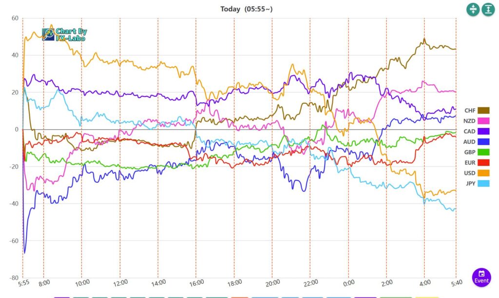 上は、13日の通貨強弱。ニューヨーク時間からスイスフランが買い、ドルと円が売りとなっています。