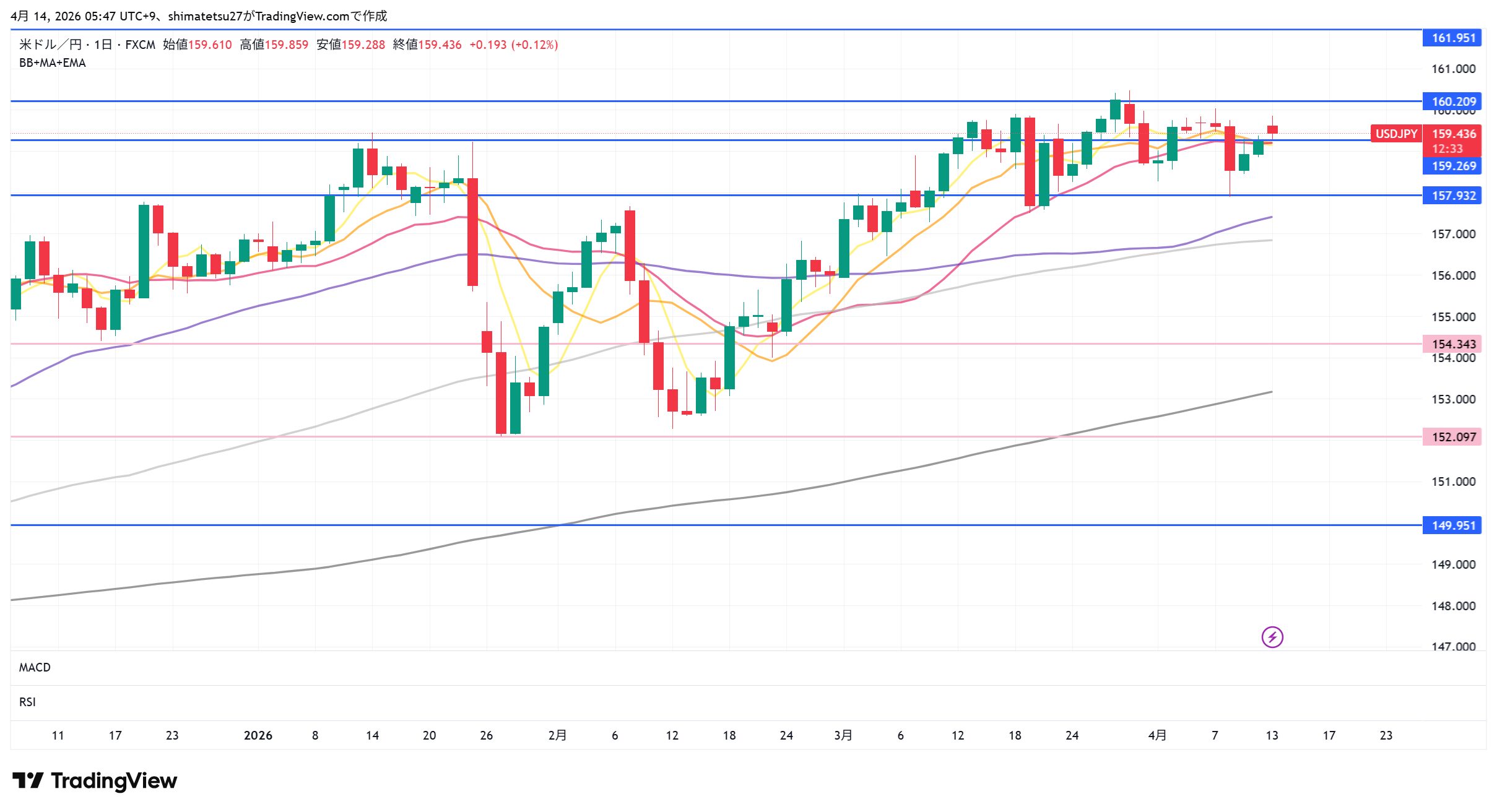 ドル円の日足チャート。4/14 6:00のレートは159.43。注目ラインは上は160.23。下は157.67となります。160以上は介入警戒のレベル。