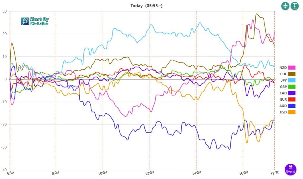 上は、14日の東京時間の通貨強弱。この時間は小動きとなっていますがロンドン時間から強弱関係が変わっています。ニュージードルとスイスフランが買い、ドルと円が売り方向になっています。