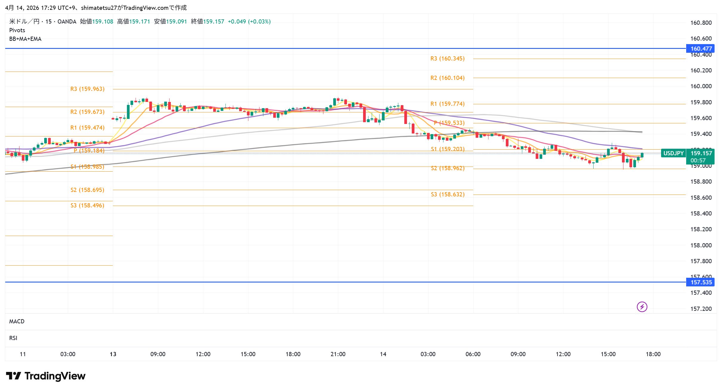 ドル円の1時間足チャート。4/14 17:30のレートは159.13。ピボットが狭く小動き。様子見の場面。