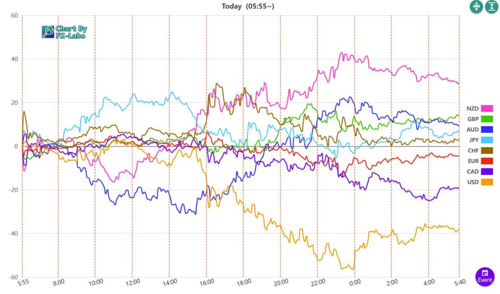 上は、14日の通貨強弱。ニューヨーク時間からニュージードルが買い、ドルが売りとなっています。