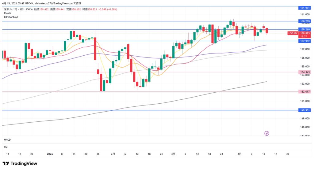 ドル円の日足チャート。4/15 6:00のレートは158.82。注目ラインは上は160.23。下は157.67となります。160以上は介入警戒のレベル。