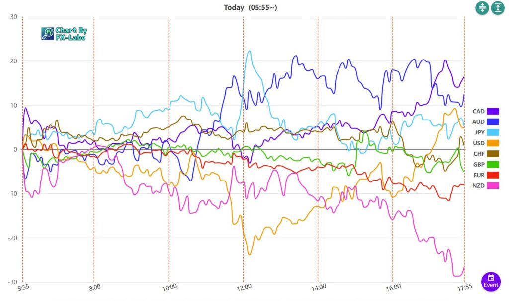 上は、16日の東京時間の通貨強弱。この時間は小動きとなっています。ニュージードルがやや売りになっています。