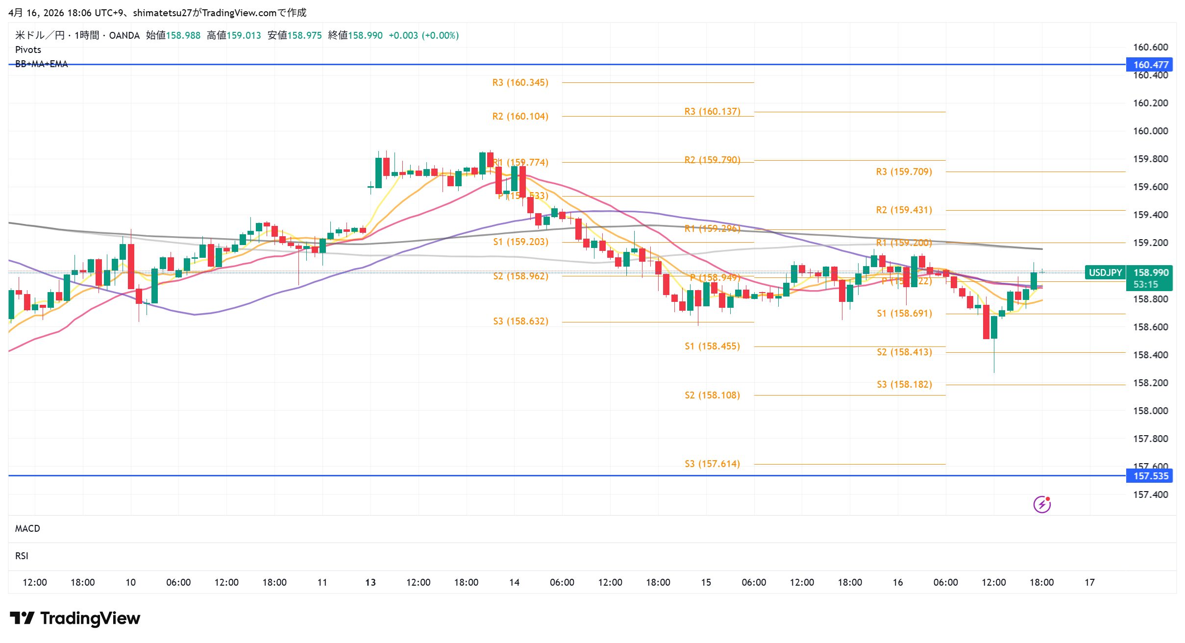 ドル円の1時間足チャート。4/16 18:00のレートは158.96。ピボットが狭く小動き。様子見の場面。