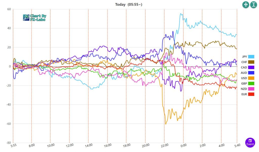 上は、17日の通貨強弱。ニューヨーク時間に円が買い、ドルが売りとなりました。