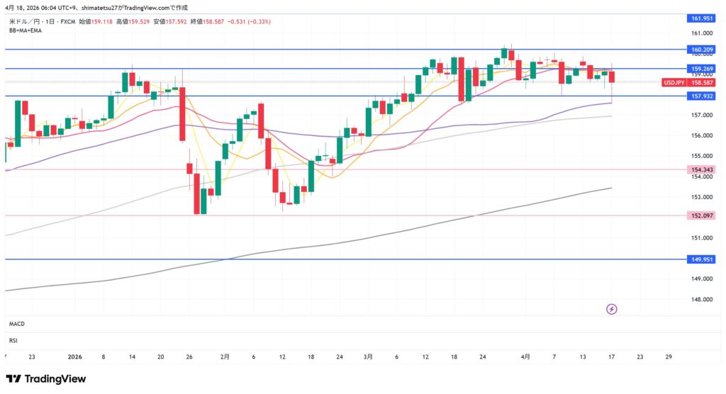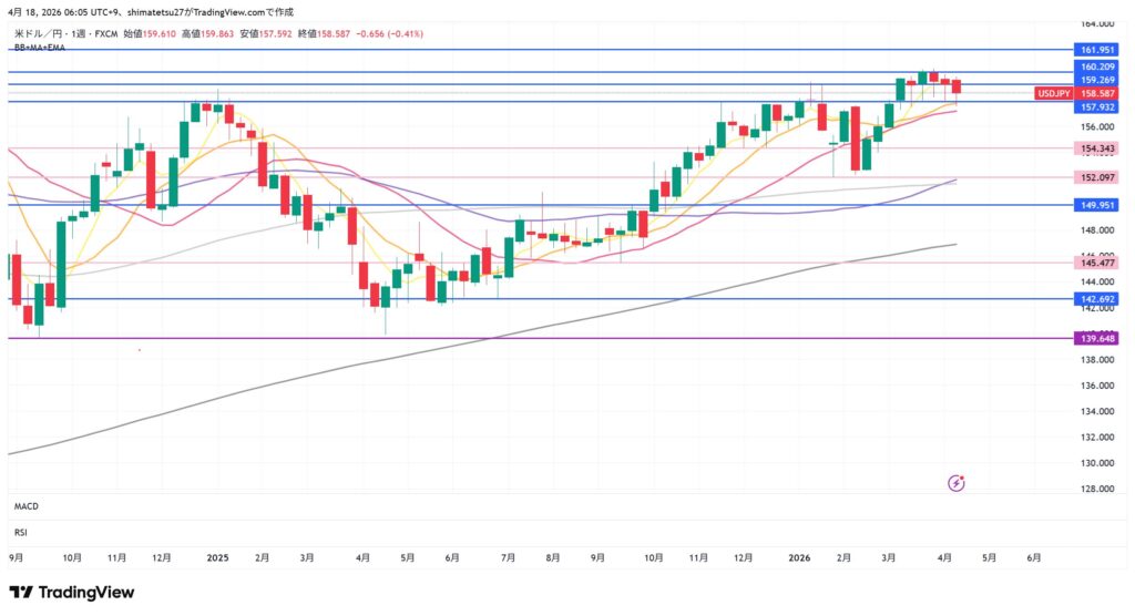 ドル円の週足。4月13日の週は下ヒゲ陰線。2025年1月から4月後半まで下落、その後上昇、2026年1月より下落傾向でしたが2月中旬から上昇。2月下旬に米・イラン戦争が勃発しました。ドル円は上昇し高止まりの状況で為替介入が警戒される