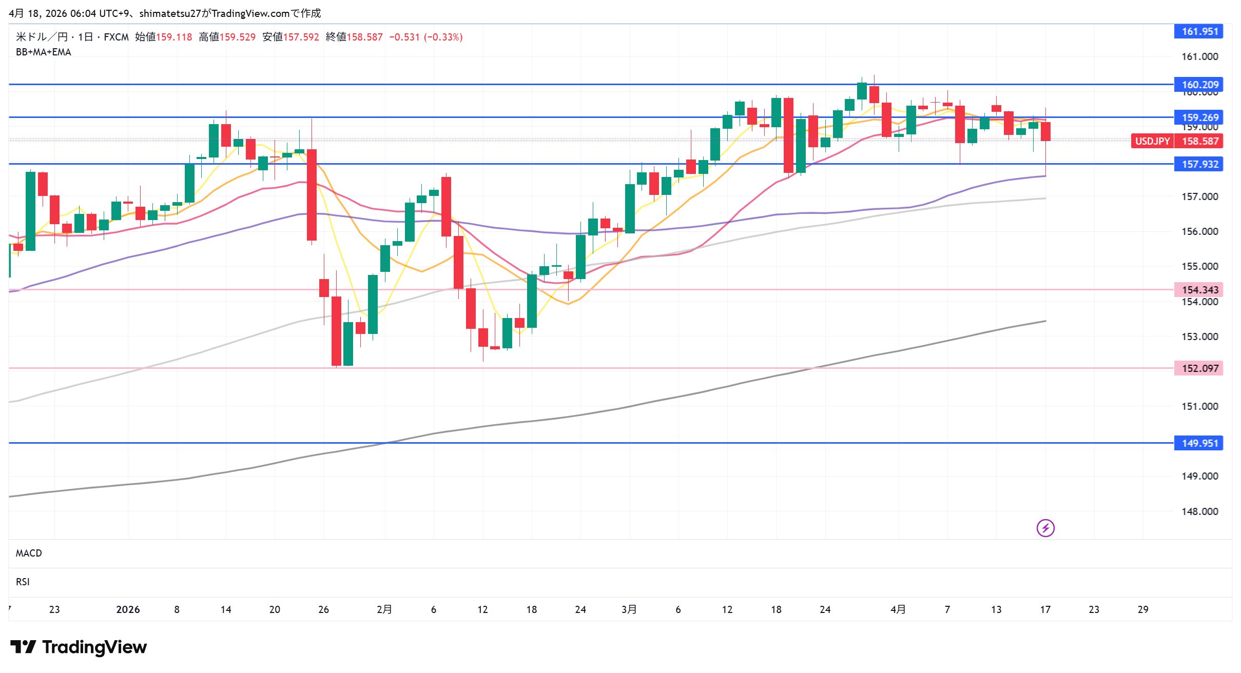 ドル円の日足チャート。4/18 6:00のレートは158.58。注目ラインは上は160.23。下は157.92となります。160以上は介入警戒のレベル。
