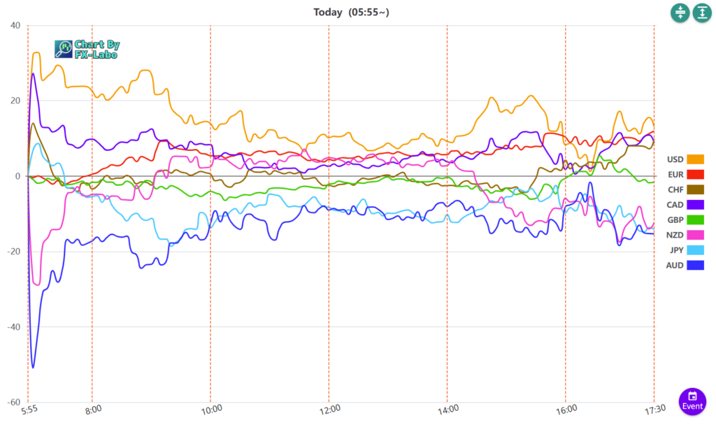 上は、20日の東京時間の通貨強弱。この時間は小動きとなっています。