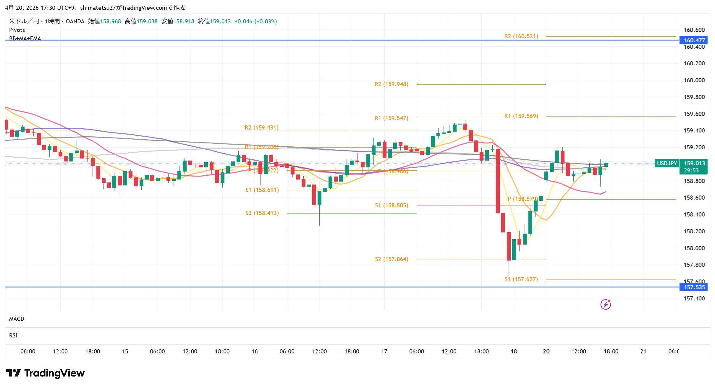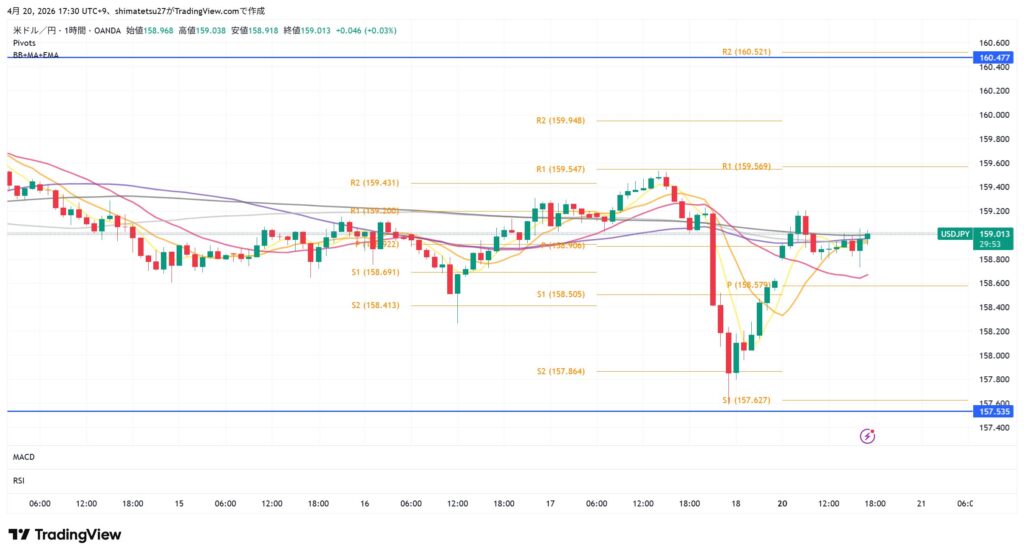 ドル円の1時間足チャート。4/20 18:00のレートは159.02。ピボットが狭く小動き。様子見の場面。