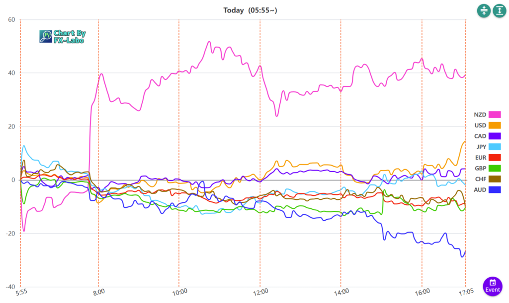 上は、21日の東京時間の通貨強弱。ニュージードルが買われました。NZのCPIが増加となりました。