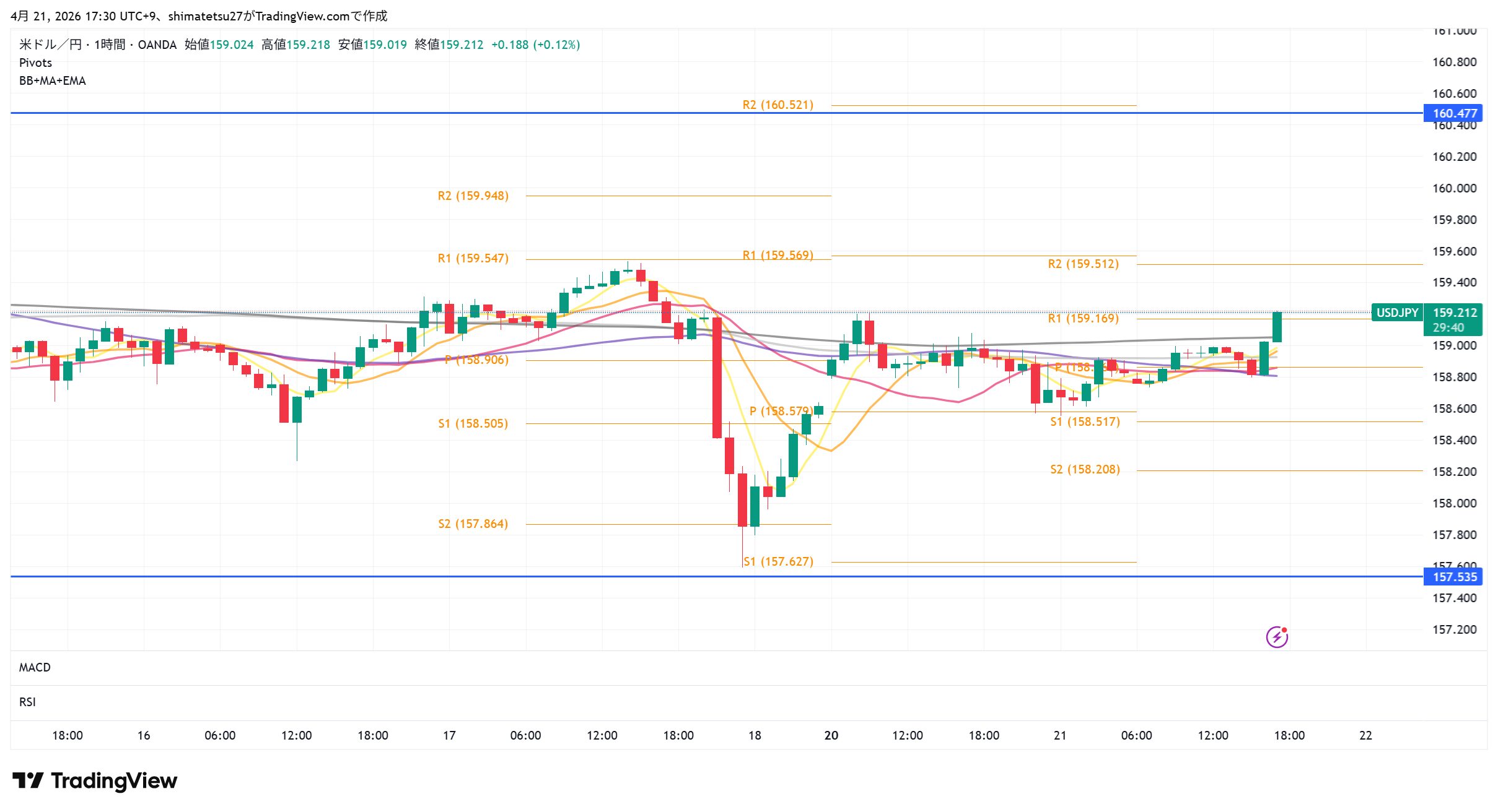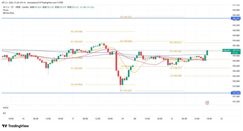 ドル円の1時間足チャート。4/21 17:30のレートは159.20。ピボットが狭く小動き。様子見の場面。ドル円がやや上昇。