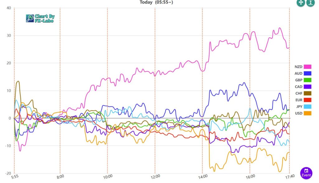 上は、22日の東京時間の通貨強弱。ニュージードルが買われ気味で、他は小動き。