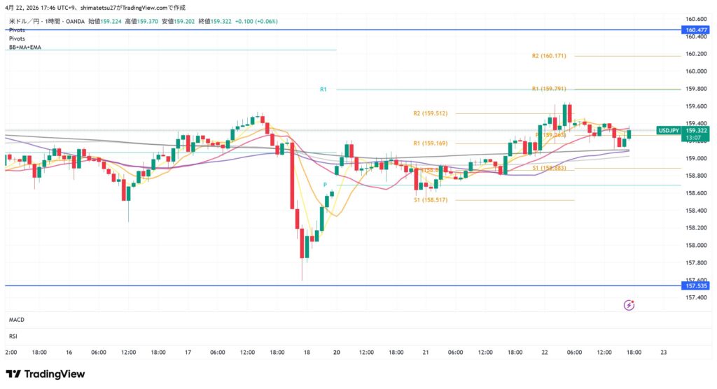 ドル円の1時間足チャート。4/22 17:30のレートは159.32。ピボットが狭く小動き。様子見の場面。