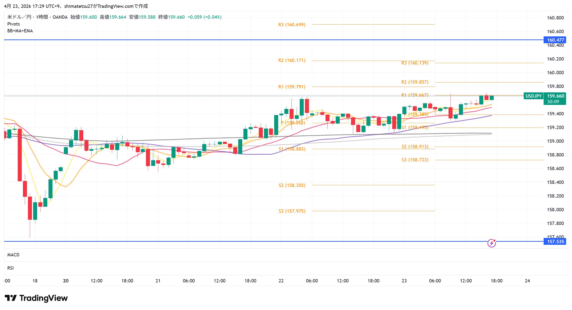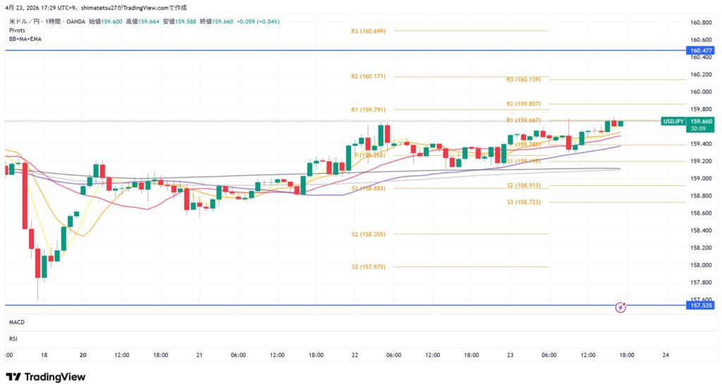 ドル円の1時間足チャート。4/23 17:30のレートは159.65。ピボットが狭く小動き。様子見の場面。