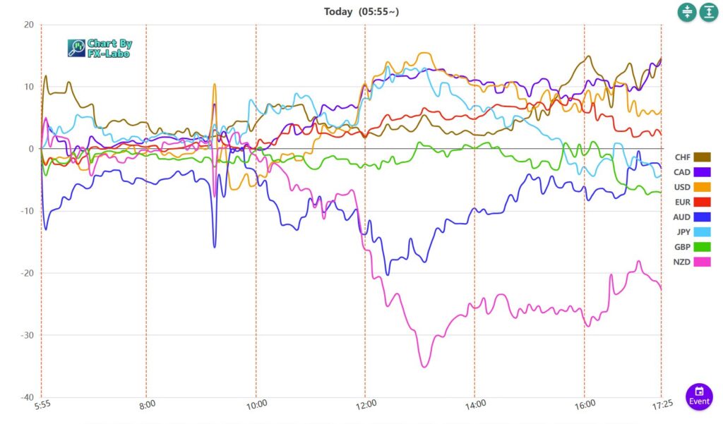 上は、23日の東京時間の通貨強弱。ニュージードルが売られ気味で、他は小動き。