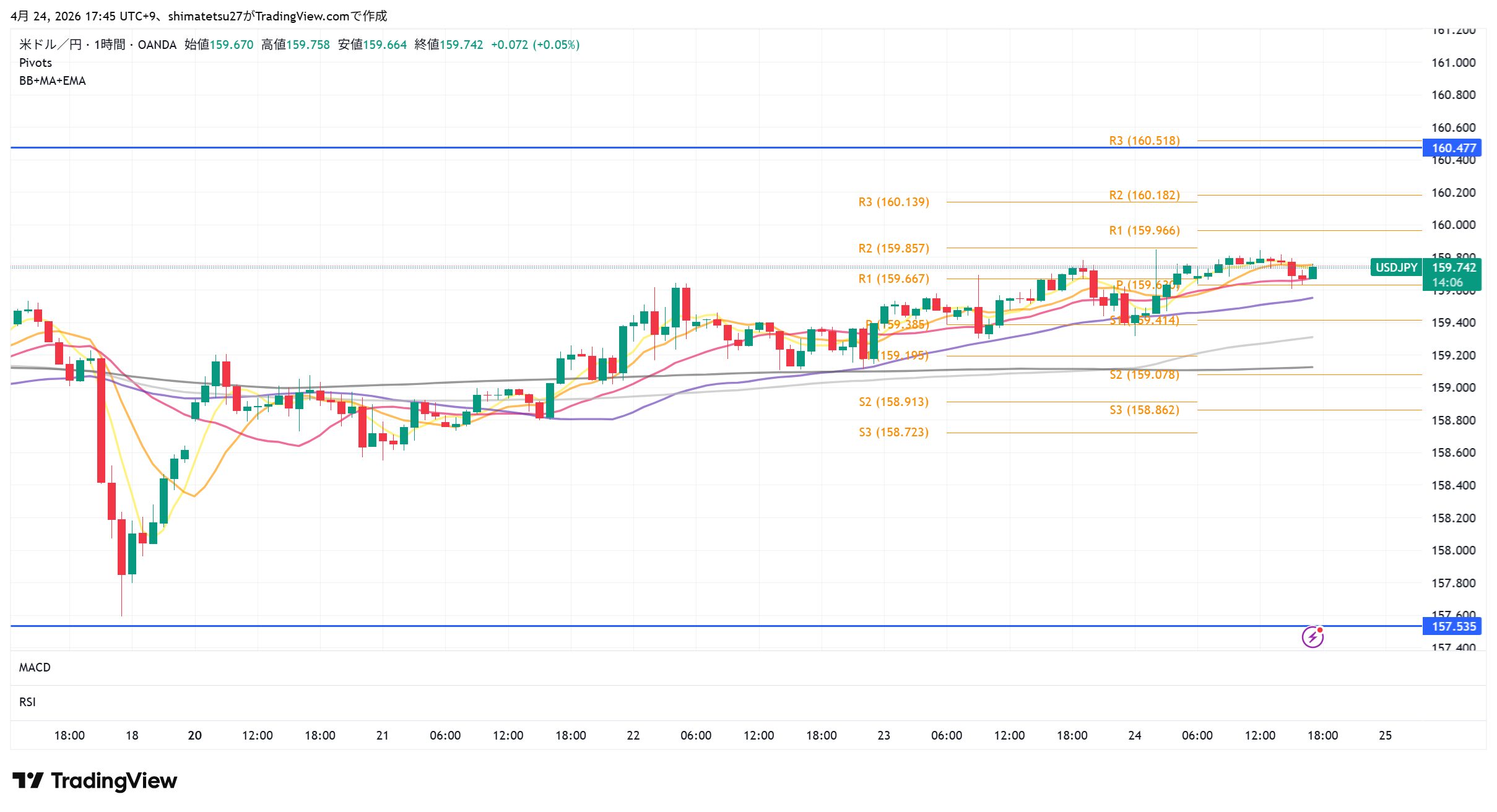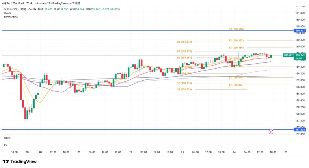 ドル円の1時間足チャート。4/24 17:30のレートは159.72。ピボットが狭く小動き。様子見の場面。