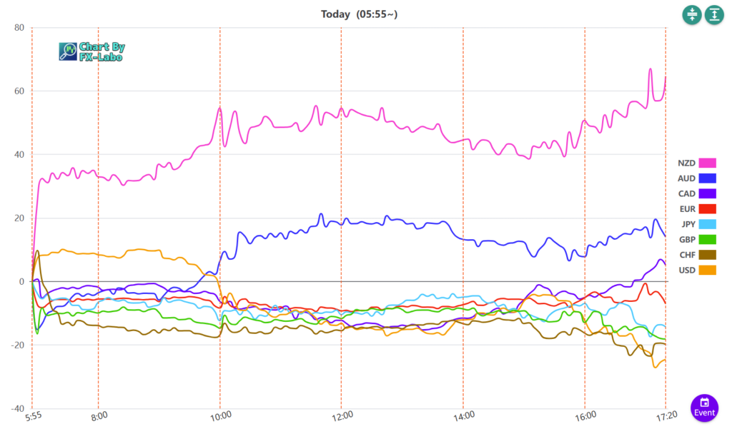 上は、27日の東京時間の通貨強弱。ニュージードルが買い。他は小動き。