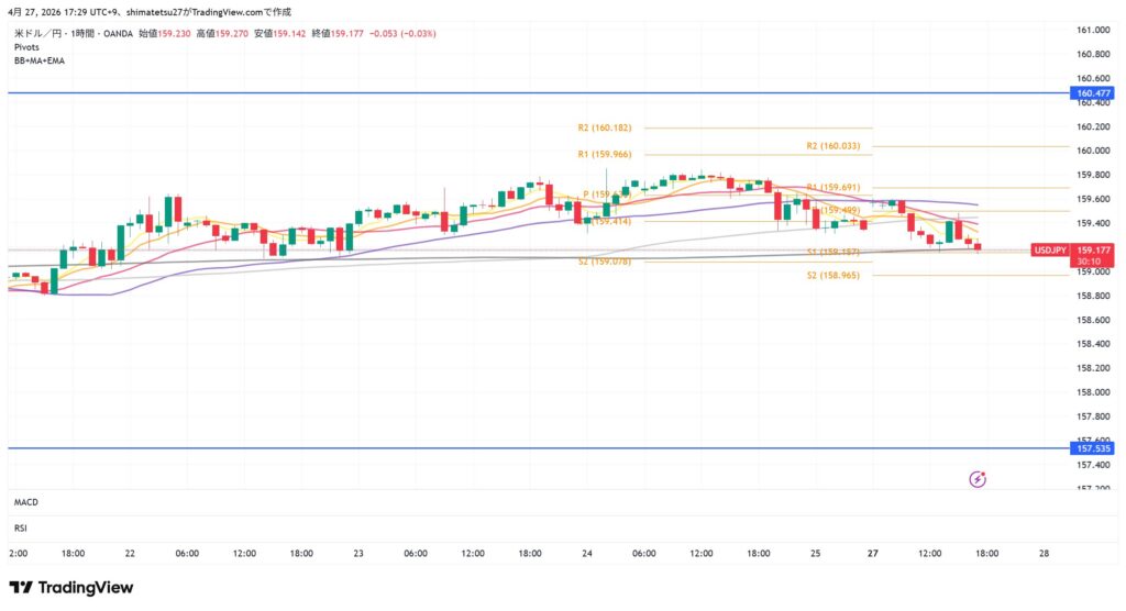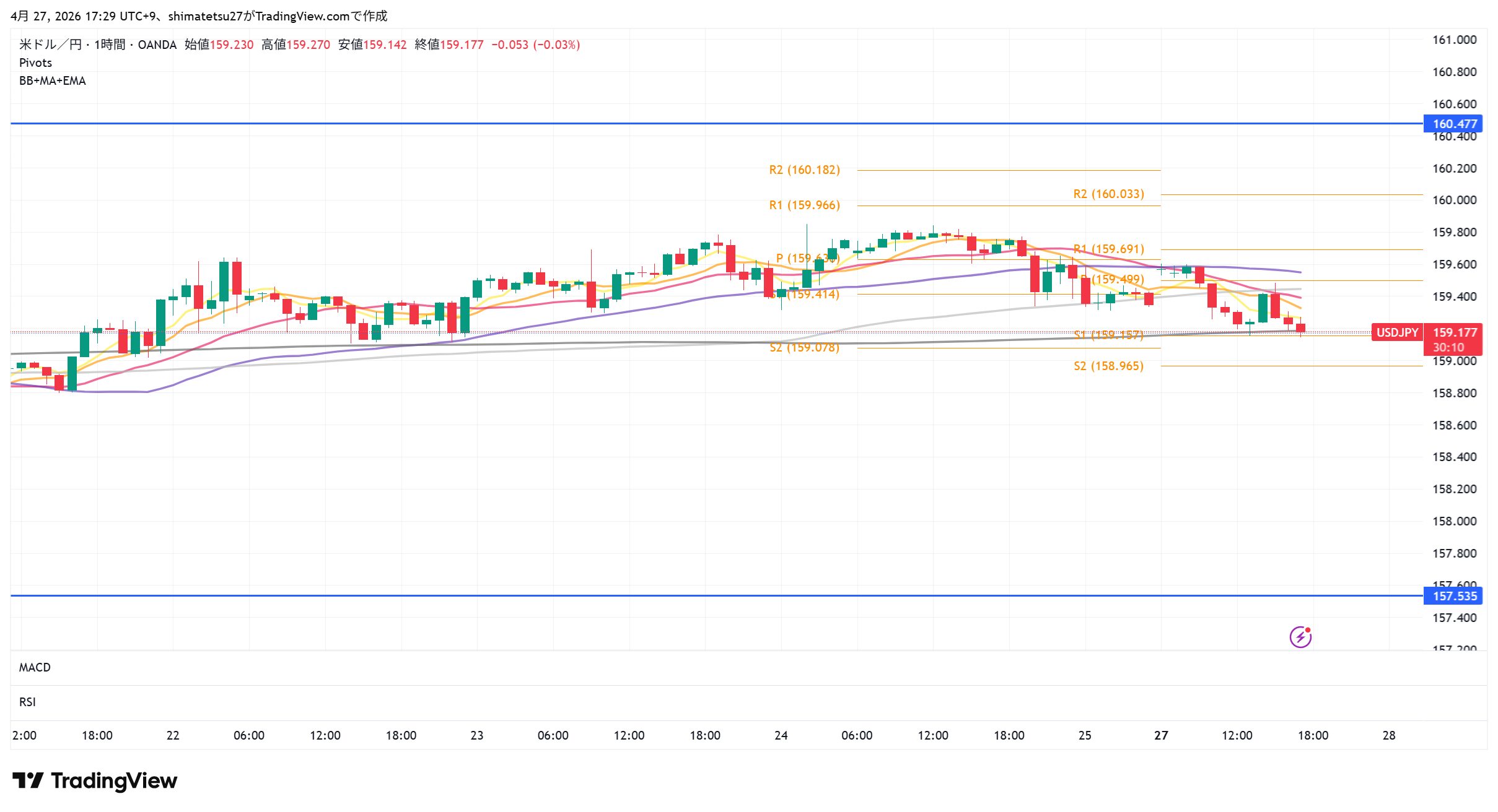ドル円の1時間足チャート。4/27 17:30のレートは159.17。ピボットが狭く小動き。様子見の場面。