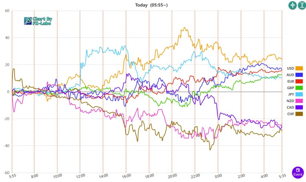 上は、28日の通貨強弱。東京時間に円が買い、ニューヨーク時間にドルが買い、スイスフランとニュージードルが売りとなりました。