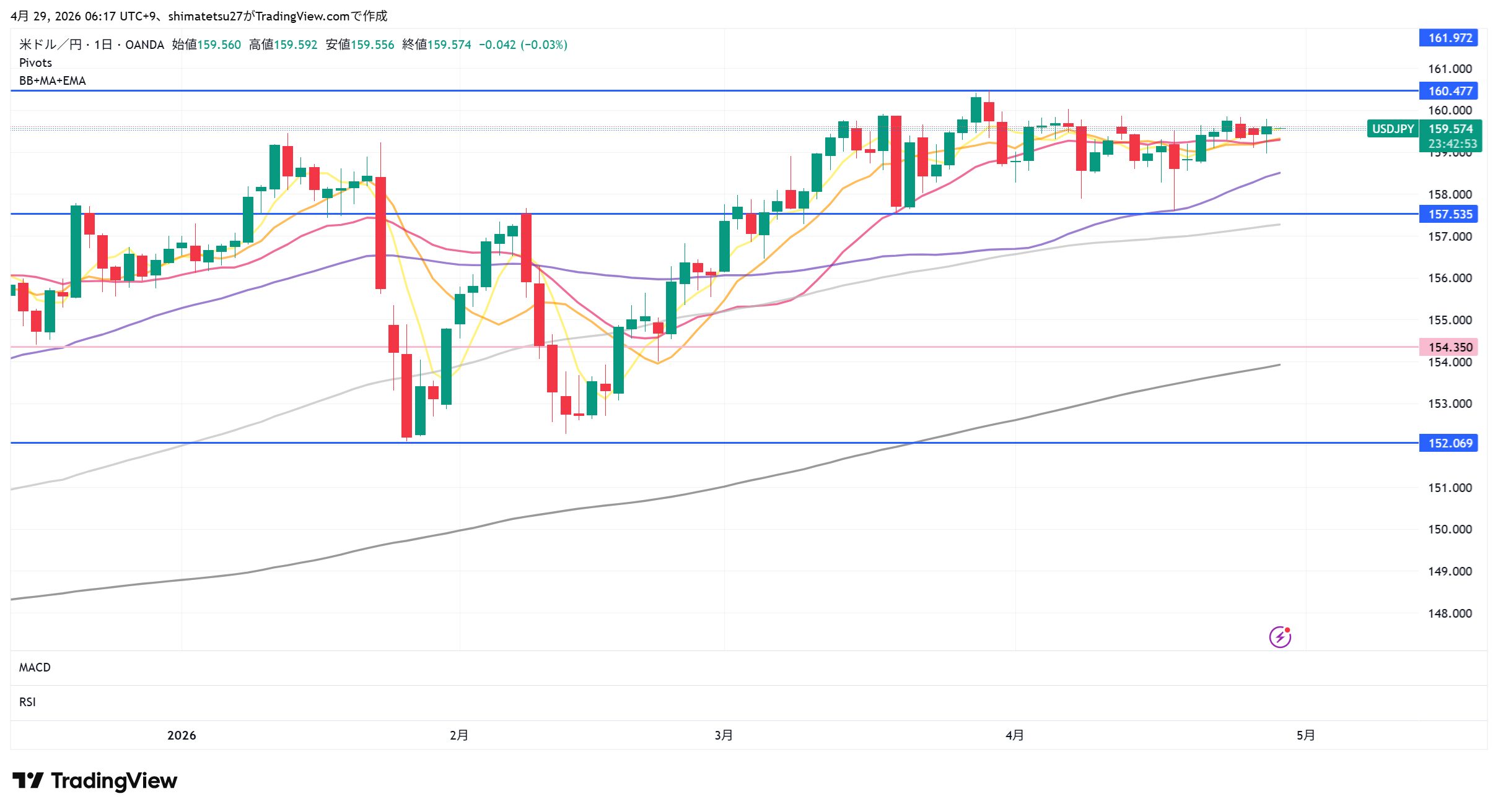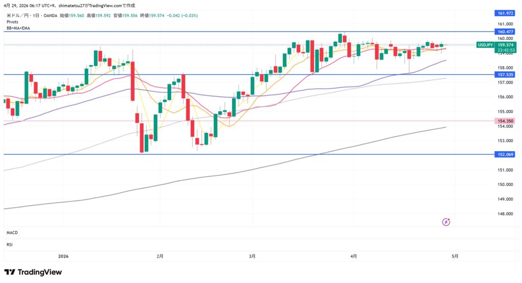 ドル円の日足チャート。4/29 6:00のレートは159.57。注目ラインは上は160.23。下は157.92となります。160以上は介入警戒のレベル。この幅のレンジは6週間続いています。明日早朝4:00にFOMC政策金利が発表されます。